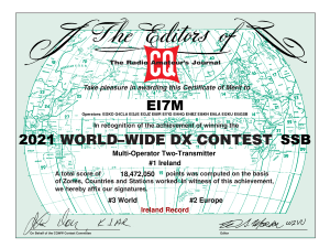 Addendum: In the multi-op 2 category, EI7M placed 3rd in the World and 2nd in Europe after our Estonian friends ES9C. PJ4K (Bonaire) took the 1st place honours. We also set a new Irish record.
